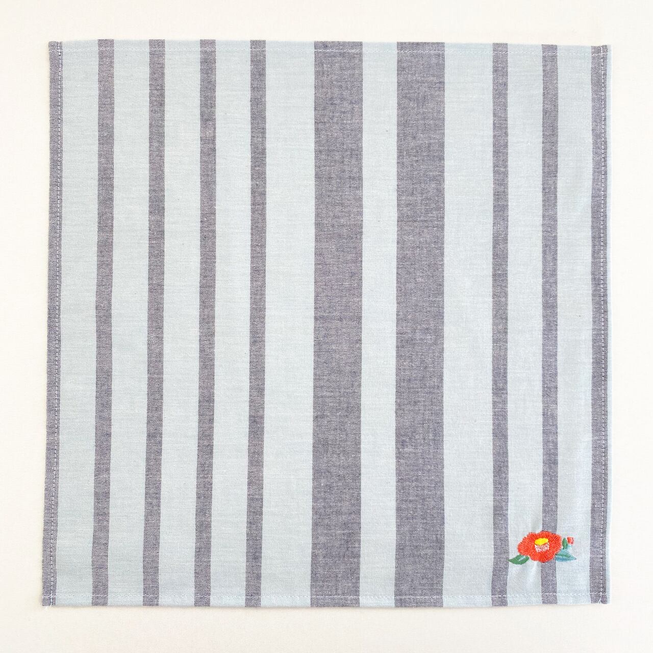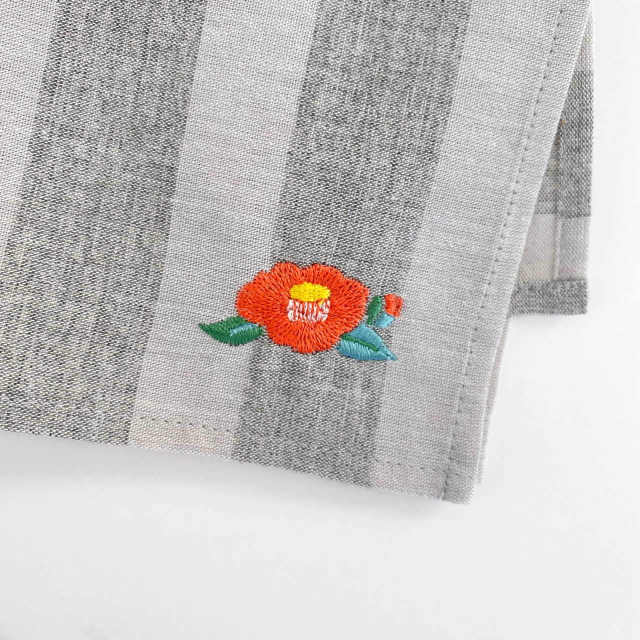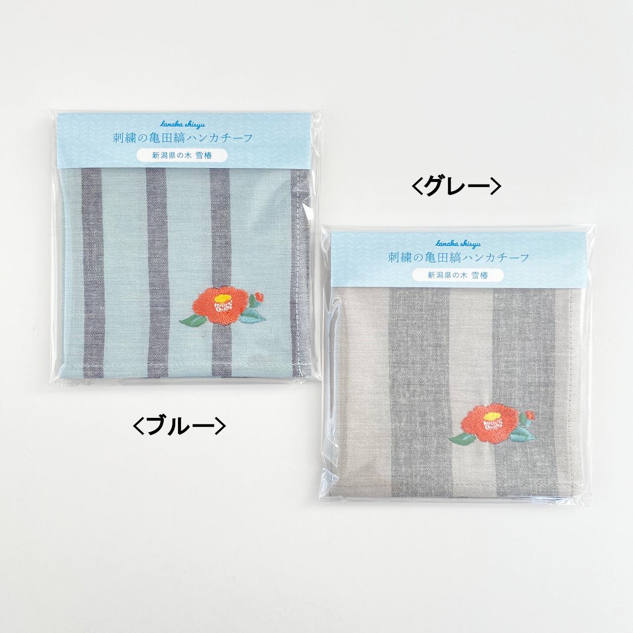 新潟県にゆかりのある草木花を、亀田縞の生地に刺繍しました。薄地でやわらかく、乾きやすい生地を使っています。ブルーとグレーの2色からお選びいただけます。