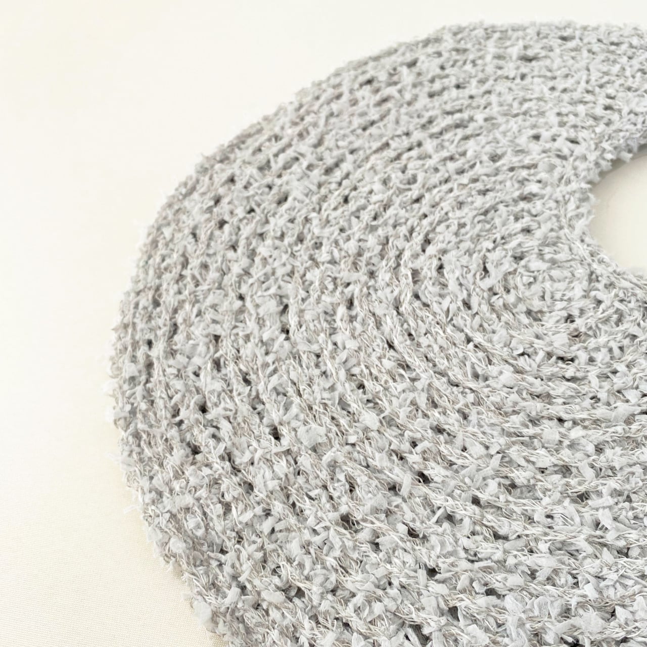 熱をかけると固まる特殊な糸を使用して、ひらひらの変わり糸とともに紐編みしています。